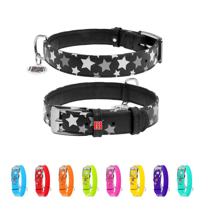 Нашийник для собак шкіряний waudog glamour з qr паспортом, візерунок "зірочка", світлонако...