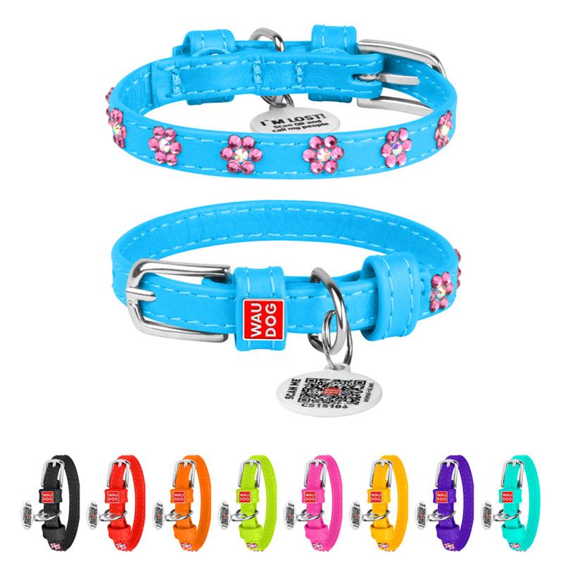 Нашийник для собак шкіряний waudog glamour з qr паспортом, з клейовими стразами "квіти", ш...