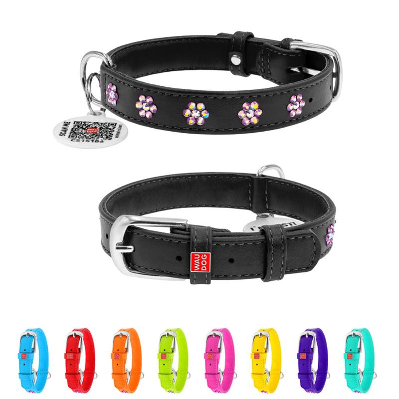 Нашийник для собак шкіряний waudog glamour з qr паспортом, з клейовими стразами "квіти", ш...