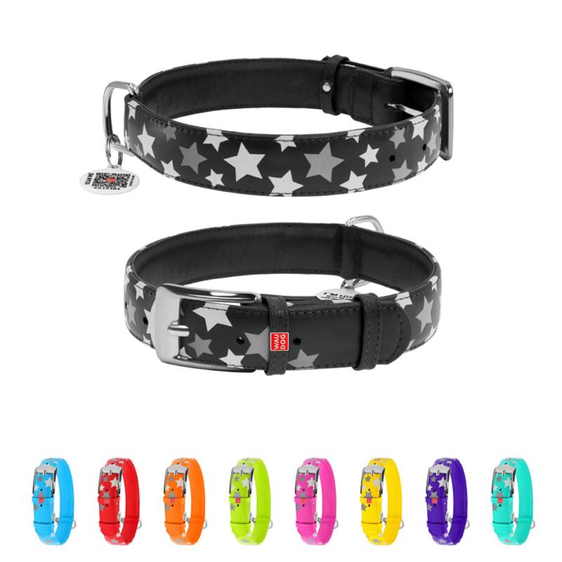 Нашийник для собак шкіряний waudog glamour з qr паспортом, візерунок "зірочка", світлонако...