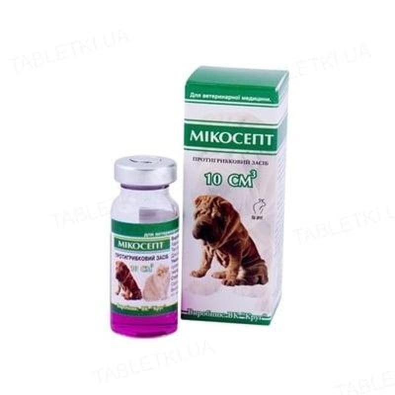 Протигрибковий засіб для зовнішнього застосування. Мазь для зовнішнього застосування трифазна, суспензионно-емульсійного типу, від майже білого до білого зі світло-жовтуватим відтінком кольору, маслянистої консистенції, з характерним запахом, з дрібними жировими зернами. Склад: 100 мл препарату містить: - клотримазол - 0,1 м - кислота саліцилова - 0,7 м - наповнювач - до 10 мл. Застосування: Мікосепт застосовують котам і собакам для лікування дерматитів алергічного і травматичного походження, обумовлених патогенними дерматофітами, дріжджовими грибами, збудники різнобарвного лишаю, грампозитивними і грамнегативними бактеріями, чутливими до компонентів препарату.