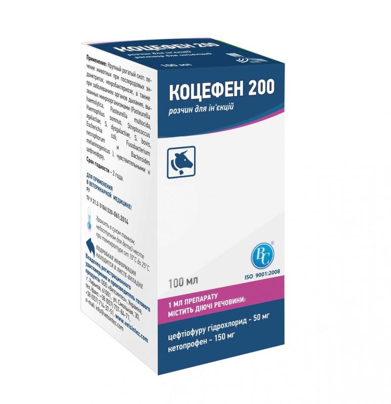 Завантажити інструкцію Склад 1 мл препарату містить активні речовина: - цефтиофура гідрохлорид — 50 мг - кетопрофен — 150 мг Показання до застосування: Лікування великої рогатої худоби у разі мастиок, ендометритів, некробактеріозу, а також у разі захворювань органів дихання, спричинених мікроорганізмами, чутливими до цефтіофури, а також використовується для комплексного лікування тварин у разі гострих і хронічних форм. запальних процесів опорно-рухового апарату, молочних залоз. Порядок застосування Застосовують один раз на добу внутрішньом'яно в дозі 1 мл на 50 кг маси тварини, у разі некробактеріозу — 3 діб, у разі захворювань дихальних шляхів — 3-5 діб, за ендометріту — 5 діб. Перед застосуванням флакон треба струсити та підігріти до 36 градусів. Протипоказання - Підвищена чутливість до цефтіофуру та інші бета-лактамні антибіотики; - Не застосовувати тваринам з алергічними проявами до кетопрофену. - Не застосовувати тваринам із гострою нирковою недостатністю; - Не застосовувати одночасно з макролідами, сульфаніламідами, антибіотиками тетрациклинового ряду, аміноглікозидами; - не використовувати одночасно з сечогінними засобами й антикоагулянтами.