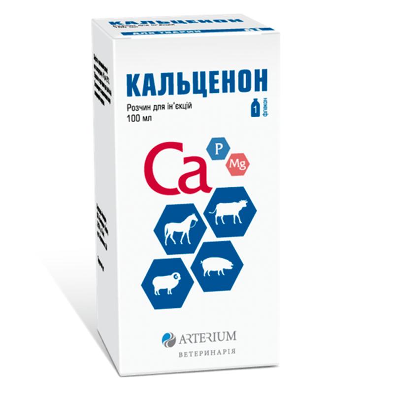 Опис Прозорий розчин від ледь жовтого до жовтого з коричнюватим відтінком забарвлення. Склад 100 мл препарату містять діючі речовини (г): кальцію глюконат 32,82; кальцію гліцерофосфат 8,13; магнію хлорид гексагідрат 4,18. Допоміжні речовини: кислота борна, натрію цитрат, вода для ін'єкцій. Фармакологічні властивості Дія препарату Кальценон визначається ефектом компонентів, що входять до його складу. Кальцій стимулює функцію серцево-судинної системи, сприяє зменшенню дисперсності білка, проникності кровоносних судин, активує процеси згортання крові, приймає участь у формуванні кісткової тканини (попереджує ризик розвитку рахіту, остеодистрофії), регулює процеси нервової провідності і м'язових скорочень, має загальнозміцнювальний, антитоксичний ефекти. Фосфор є складовою нуклеопротеїдів і фосфоліпідів, стимулює процеси асиміляції, позитивно впливає на обмін речовин у тканинах організму. Магній сприяє обміну фосфору і вуглеводів як кофермент. Його недостатність в організмі тварини викликає надмірне збудження. При комплексному введенні магній блокує нервово-м'язову трансмісію і попереджує розвиток судом. Застосування Кальценон призначають з метою профілактики і лікування сільськогосподарських тварин при: - тетаніях (у період вагітності, лактації, при транспортуванні, випасі і т. д.); - післяродових парезах та парезах, які викликані нестачею кальцію і фосфору; - порушенні обміну кальцію, фосфору, магнію (рахіт, остеодистрофія, остеомаляція, вагітність та ін.); - ацетонемії; - отруєнні свинцем, фтором, щавлевою кислотою (як допоміжна терапія при комплексному лікуванні); - токсикозі, алергії, геморагічному діатезі, гематурії, гемоглобінурії. Дозування Види тварин Доза препарату в мл на одну тварину Спосіб введення коні з масою тіла до 500 кг 80-100 внутрішньовенно велика рогата худоба з масою тіла до 500 кг (будьякого віку) 80-100 внутрішньовенно, внутрішньом'язово, підшкірно вівці, кози 15-25 внутрішньовенно, внутрішньом'язово, підшкірно свині 15-25 внутрішньовенно, внутрішньом'язово поросята 2-3 внутрішньом'язово, двічі з інтервалом 24 години Кальценон вводять одноразово. Можливе повторне застосування препарату через 24 години у тих же дозах. Великій рогатій худобі підшкірно не вводити в одне і те ж місце більше 50 мл препарату, внутрішньом'язово -- більше, ніж 25 мл. Вівцям і козам внутрішньом'язово в одне і те ж місце не вводити більше 15 мл препарату. Внутрішньовенно препарат вводять повільно і рівномірно. Протипоказання Протипоказаний при гіперкальціємії, ацидозі, важких порушеннях функцій нирок, миготливій аритмії передсердь, підвищеній чутливості до компонентів препарату. Кальценон не рекомендується назначати тваринам одночасно з препаратами дигіталісу, з вітаміном D та його аналогами. Побічна дія Даних немає. Застереження У випадках гіперкальціємії (при передозуванні) можуть виникати: анорексія, болі в м'язах, нудота, блювання, спрага, поліурія. В особливо важких випадках гіперкальціємія може викликати брадикардію і аритмію. Специфічного антидоту немає. Лікування симптоматичне. Форма випуску Розчин у cкляних пляшках по 100 мл. Зберігання Зберігати в оригінальній упаковці при температурі від + 5°С до +25° С. Зберігати в недоступному для дітей місці. Термін придатності 2 роки.