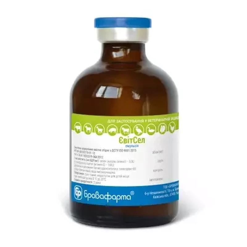 Склад 1 мл препарату містить (за АДР): α-токоферолу ацетат — 100 мг селен (натрію селеніт) — 0,3 мг Опис Емульсія білого кольору. Фармакологічні властивості Вітамін Е і селен — природні високоактивні антиоксиданти з різними механізмами дії, ефективно доповнюють один одного, протидіють утворенню вільних радикалів і деструктивному впливу на мембрани клітин. Вітамін Е перешкоджає окисненню ліпідів у мембранах клітин через гальмування процесів утворення перекису водню. Селен через гідроксилювання бере участь у створенні глютатіонпероксидази та здатний не тільки перетворювати перекис водню на менш небезпечні спирти, але й запобігати виникненню вільних радикалів. Вітамін Е стимулює синтез багатьох ферментів, бере участь у метаболізмі нуклеїнових кислот і простагландінів, покращує тканинне дихання, стимулює синтез білків, захищає від окиснення вітамін А, інгібує синтез холестерину та нормалізує вміст ліпідів у крові. Селен бере участь в утворенні понад 30 потрібних організму гормонів, ферментів та інших біологічно активних речовин, стимулює еритроцитопоез, покращує живлення клітин киснем. Вітамін Е із селеном непрямо активізують захисні функції клітинного та гуморального імунітету та імунної системи організму загалом, підвищують репродуктивність тварин через поліпшення спермоутворення в самців, активності матки та відновлення нормального функціонування яєчників після пологів у самок. Показання Застосовують Велика рогата тварина, вівці, кози, свині в комплексі терапевтичних заходів щодо посилення загальної та специфічної резистентності організму, а також для профілактики та лікування захворювань, що розвиваються на тлі недостатності токоферолу та селену — м'язова дистрофія, білішкова хвороба. , безпліддя самців, зниження репродуктивності та безпліддя самок, спадкова загибель, вагітність, післяпологові ускладнення, кетоз, затримки росту та розвитку молодняка. Курам та індичкам використовують для збільшення приросту та яйценосності. Протипоказання Під час використання в рекомендованих дозуваннях протипоказань немає. Спосіб застосування та дози Препарат застосовують внутрішньом'ячно або підшкірно в таких дозах: - самки тварин (корови, свиноматки, вівці, кози) — 1 мл на 50 кг маси тіла, 2 рази через 1 місяць, остання ін'єкція — за 30 діб до очікуваних пологів; - виробники - 1 мл на 50 кг маси тіла, 3 рази за 3 тижні, за місяць до активного сезону; - телята, ягнята, козлята - 0,2-0,3 мл на 10 кг маси тіла; - підсушені поросята - 1 мл на тварину за тиждень до від'єму; - відстоюють у рості та розвитку поросята — 1 мл на 10 кг маси тіла, 3-4 рази за 7 днів. Птахи застосовують перорально, з питною водою в таких дозах: - кури, індички — 0,5 мл на 1 л води; - молодняк птиці (циплята, індичка, каченята, гусенята) — 1 мл на 1,5 л води в перший тиждень життя, курс — 3-5 днів. Застереження Не вводити в одне місце понад 10 мл препарату. У деяких тварин у місці введення може виникнути набряк, який зникає через 2-3 дні без додаткового лікування. Вживати в їжу продукти тваринництва людям можна без обмежень. Умови зберігання У сухому темному місці за температури від 0 до +25 °C. Термін придатності 2 роки.