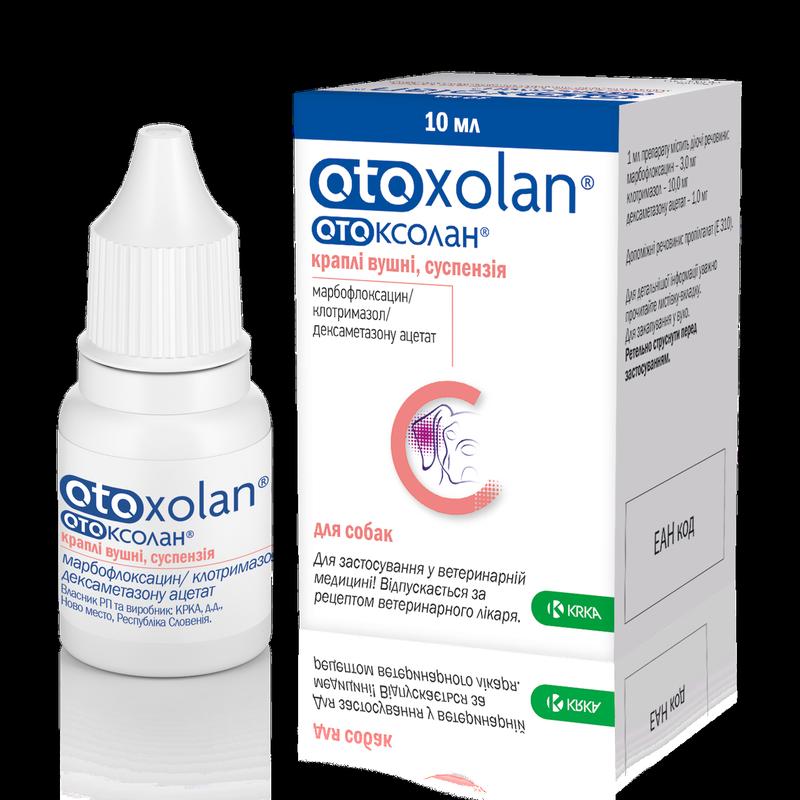 В'язка, майже жовтого кольору, опалесцентна суспензія. Склад: 1 мл препарату містить діючі речовини: марбофлоксацин - 3,0 мг; клотримазол - 10,0 мг; дексаметазону ацетат - 1,0 мг. Допоміжна речовина: пропілгалат (Е 310). Застосування: Лікування собак, хворих на зовнішній отит при ураженні бактеріями, чутливими до марбофлоксацину і грибами, особливо Malassezia pachydermatis, що є чутливими до клотримазолу. Дозування: Лише для зовнішнього застосування - закапування в вухо. Перед застосуванням препарату слід ретельно очистити та висушити зовнішній вушний канал, а також ретельно струсити флакон з препаратом протягом 30 секунд і обережно видавити, щоб заповнити піпетку. Рекомендована доза становить по десять крапель у вухо один раз на добу протягом 7-14 днів. Після 7 діб лікування, ветеринарний лікар повинен оцінити необхідність продовжити лікування ще на тиждень. Одна крапля препарату містить 71 мкг марбофлоксацину, 237 мкг клотримазолу і 23,7 мкг дексаметазону ацетату. Після введення препарату ретельно і обережно масажують вухо для того, щоб препарат міг проникнути у нижню частину слухового проходу. Якщо препарат призначений для використання для декількох собак, на кожну окрему собаку використовується окрема піпетка. Протипоказання: Не застосовувати тваринам з підвищеної чутливості до діючих речовин, інших азолових протигрибкових засобів, будь-яких інших фторхінолонів або до будь- якої з допоміжних речовин. Не застосовувати препарат тваринам з перфорацією барабанної перетинки. Не призначати вагітним або лактуючим тваринам. Застереження: Особливі застереження при використанні Препарат слід використовувати після визначення чутливості мікроорганізмів до марбофлоксацину. За своєю природою бактеріальний і грибковий отит часто є вторинним захворюванням. Слід виявити основну причину захворювання та лікувати її. Спеціальні застереження: Призначення препарату повинно здійснюватися згідно результатів визначення in vitro чутливості мікроорганізмів до маобофлоксацину. Використання компонентів препарату може викликати тимчасову глухоту або часткову втрату слуху у чутливих собак або собак старшого віку. Перед застосуванням препарату слід перевірити цілісність барабанної перетинки. Тривале та інтенсивне використання кортикостероїдів для місцевого застосування, як відомо, викликає місцеві та системні ефекти, включаючи пригнічення функції надниркових залоз, потоншення епідермісу та уповільнене загоєння ран. Виробник: KRKA, Словенія