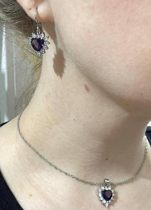 Оригінальний подарунок дівчині - набір "сердечки аметист у сріблі" кольє та сережки в оксамитовій коробочці