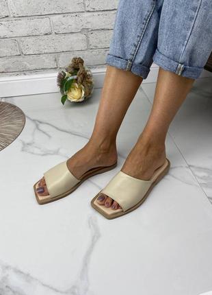 Шльопанці жіночі шкіряні бежеві плетені шльопки з квадратним носком шлепанцы женские бежевые