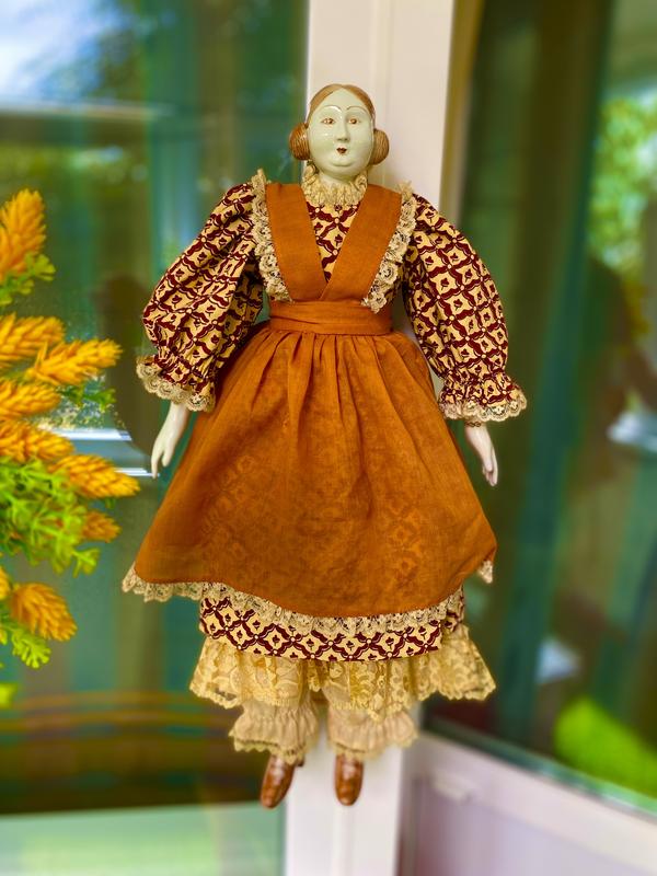 Незвичайна ексклюзивна колекційна красуня! 🍓🎠☘️ Антикварна лялечка з обличчям з білосніжної хрусткої порцеляни, бліда, довгонога і носата як справжня аристократка! Кінець ХІХ - початок ХХ століття, Німеччина! Зріст ляльки - 60 см. Голова з плечами, ручки та чобітки порцелянові. Тіло і одяг - ручна робота з натуральної бавовни, обшиті тоненьким мереживом! Вдягнена в довгу сукню, спідні панталони та спідницю, фартух з чепчиком, окремо зшитий бюст. Весь одяг оброблено акуратним ручним швом, доповнено металевими гачками і кнопками. Стан відповідно фото, ідеальний, як на мене!