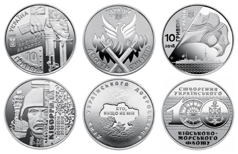 Набір обігових монет 2018 року 100-річчя створення " Українського військово-морського флоту Присвячена 100-річчю створення " Українського військово-морського флоту`. Центральною Радою на початку 1918 року було прийнято ряд важливих військово- морських законів, які на той час мали декларативний характер, у тому числі один із найголовніших - `Тимчасовий закон про флот`. 29 квітня 1918 року адмірал М. Саблін - командуючий Чорноморським флотом, ураховуючи настрої більшості українських моряків, офіційно проголосив увесь Чорноморський флот у Севастополі та Криму флотом УНР та покаравши підняти український прапор. Цей день ставши видатним для українського державного флоту та святому українського моря, вдень, коли `ціла українська фльота виявила свою приналежність до Батьківщини`. День українського добровольця Присвячена самовідданості, мужності та героїзму захисників незалежності, суверенітету і територіальної цілісності України - учасникам добровольчих формувань, які стали гордістю українського народу. Захисникам Донецького аеропорту Присвячена вшануванню мужності та героїзму захисників Донецького аеропорту - `кіборгам`, які обороняли його протягом 242 днів, що стало символом самовідданої боротьби за територіальну цілісність України.