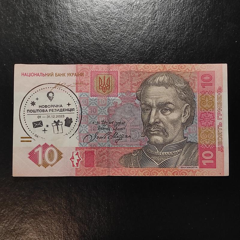 Банкнота 10 гривень ЦЄ8673861 спецпогашення штамп Новорічна поштова резиденція грудень 2023 року, місто Запоріжжя. Купюра з обігу.