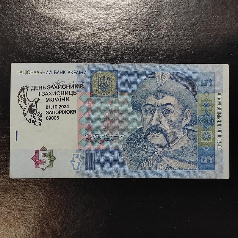 Банкнота 5 гривень ЮИ4911678 спецпогашення штамп "День захисників і захисниць України" 01.10.2024 року, місто Запоріжжя, 69005. Купюра з обігу.