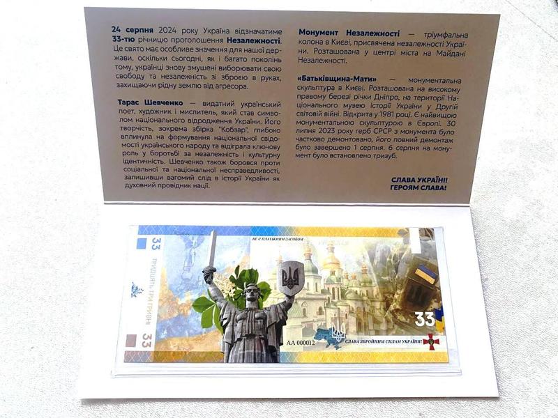 Банкнота 33 гривні 2024 р день незалежності україни у буклеті