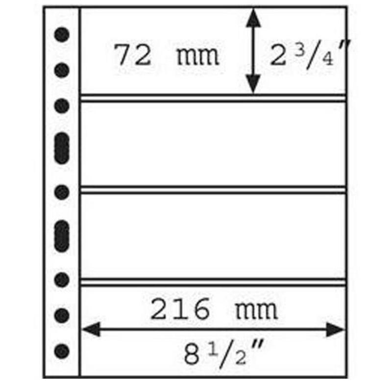 Лист GRANDE для чотирьох банкнот, виробництва німецької фірми LEUCHTTURM. Аркуші GRANDE LEUCHTTURM вирізняються гарною прозорістю та стабільністю форми. Виготовлені з поліпропілену, що не містить окисних і розм'якшувальних компонентів. Розмір аркуша: 240 х 312 мм. Внутрішній розмір поділки: 72 х 216 мм. Ціна за один аркуш.