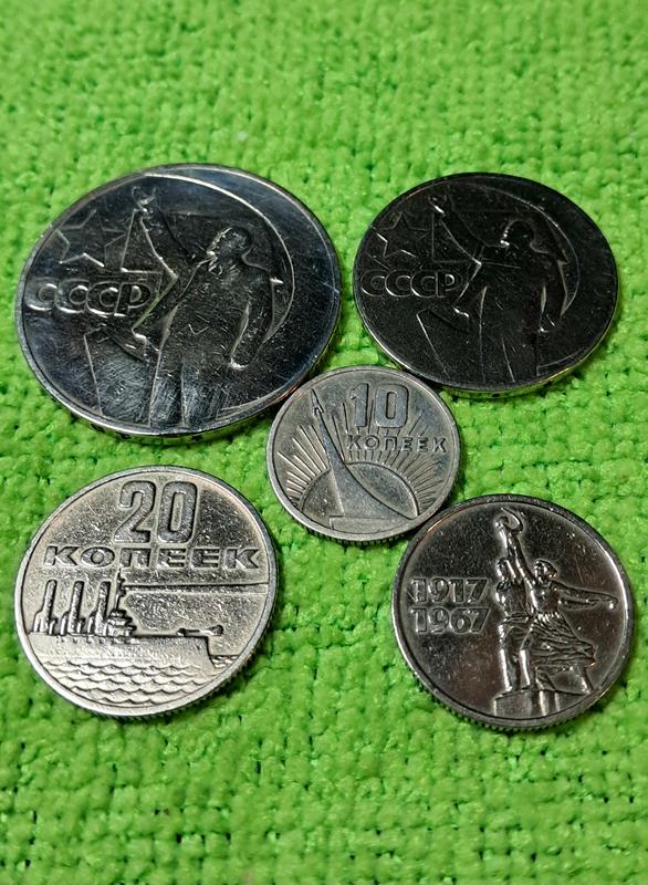 Набір ювілейних монет 1967 року ,,50 років Радянської влади" Ціна вказана за комплект (5 монет) : 1 рубль,50 коп.,20 коп.,15 коп.,10 коп. Стан монет-по фото !!!