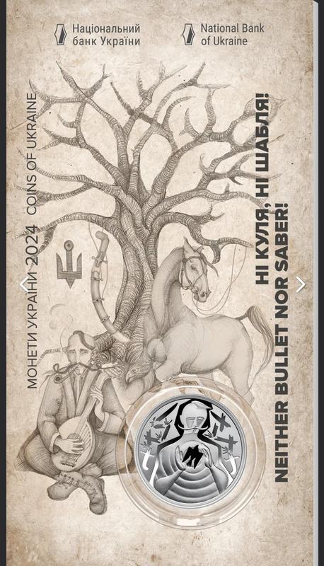 Монета Ні куля ні шабля Номінал 5 гривень Рік карбування 2024 Діаметр 35мм Типаж 75 000 Гурт рифлений Метал нельзойбер Серія ЗСУ Сувенірне пакування