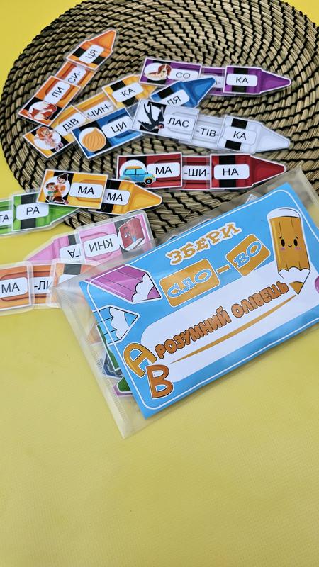 Шукаєте цікаву та корисну гру для розвитку вашої дитини? Ігра на липучках "Збери слово" – ідеальний вибір! Ця захоплююча гра допоможе вашій дитині вивчати слова та розвивати мовні навички в ігровій формі. Як це працює? Гра складається з деталей, на яких надруковані склади слів. Кожна деталь з'єднується з іншою за допомогою липучок, що дозволяє дитині легко збирати слова. Всі деталі надруковані на фотопапері та заламіновані, що забезпечує їх довговічність та стійкість до зношування. Особливості гри: - Розвиток мовлення: Гра допомагає дітям вивчати нові слова та покращувати мовні навички. - Інтерактивність: Липучки дозволяють легко з'єднувати деталі, що робить гру захоплюючою та цікавою. - Якість: Всі деталі надруковані на високоякісному фотопапері та заламіновані для довговічності. - Форма олівця: Зібране слово виглядає у формі олівця, що додає грі додаткової привабливості. Чому варто обрати гру "Збери слово"? Ця гра не тільки розважає, але й сприяє розвитку важливих навичок у дітей. Вона допомагає розвивати дрібну моторику, логічне мислення та мовлення. Граючи, діти вчаться складати слова з окремих складів, що робить процес навчання цікавим та ефективним. Не втрачайте можливість подарувати вашій дитині захоплюючу та корисну гру! Замовляйте ігру на липучках "Збери слово" вже сьогодні та спостерігайте, як ваша дитина розвивається граючи!