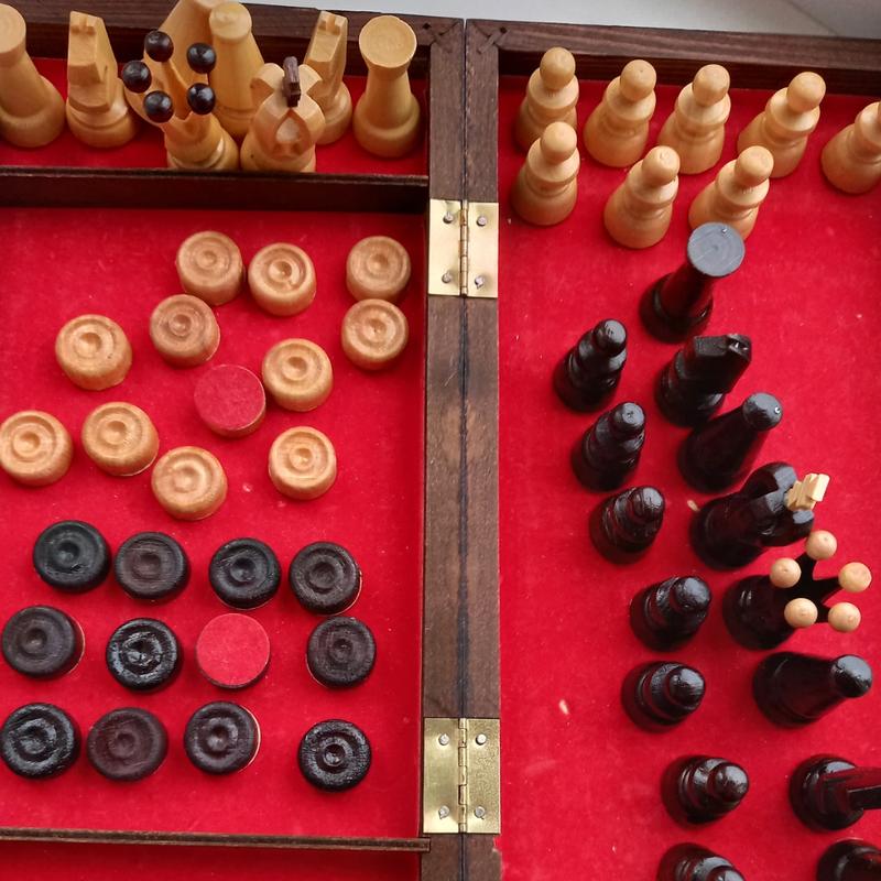 Набiр шахiв та шашок з натурального дерева. Дуже гарний стан фiгур, без дефектiв, однак на пiдкладцi всерединi присутнi потертостi (див. фото). Повний набiр. Гарна робота.