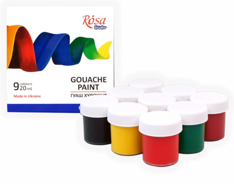 Гуашь художественная ROSA STUDIO - прекрасное решение для тех, кто овладевает живописью и декоративно - прикладное искусство. Свойства: - гуашь высокопигментированная - имеет хорошую покровную способность; - цвета насыщенные даже после высыхания - не светлеют; - краски легко смешиваются и не дают грязи (при смешивании до 3-х цветов); - Благодаря сливочной консистенции краска ложится на поверхность равномерным слоем. В состав набора входит 9 красок в банках по 20мл: белила титановые, желтая светлая, натуральная охра, красная, красная темная, фиолетовая, ультрамарин, синяя темная, зеленая светлая, зеленая темная, коричневая темная, черная. Изготовлены в Украине!