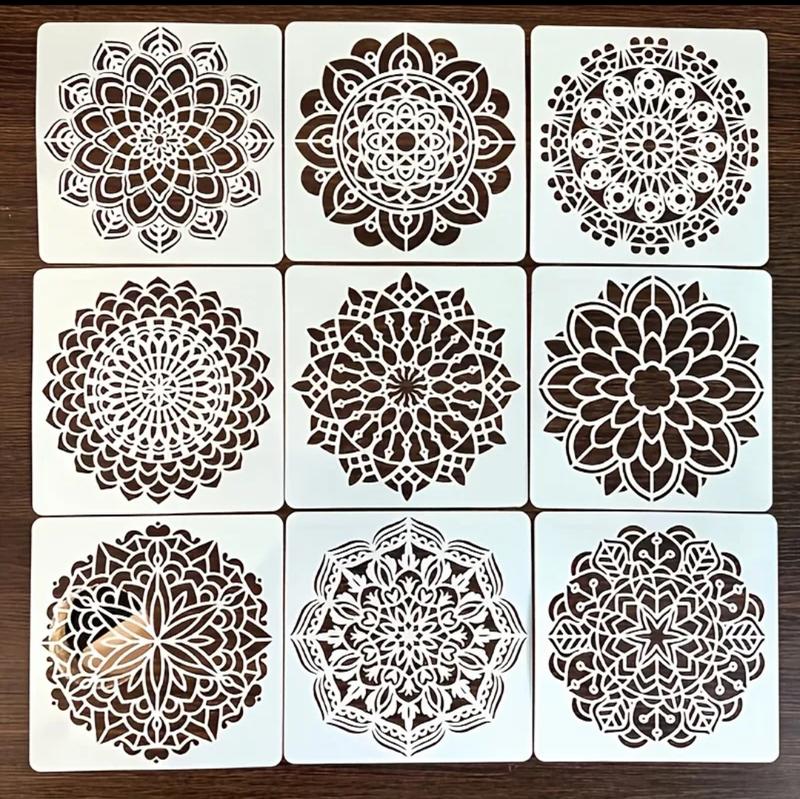 Трафарет Мандала (набір 9шт, 15*15см) Трафарет дуже гарний з вишуканими квітковими та геометричними візерунками. Трафарет пластиковий, якісний, для багаторазового використання Можна використовувати для малювання, розпису аерографом, прикраси тортів за допомогою какао чи цукрової пудри скрапбукінгу, рукоділля Дивіться інші мої лоти