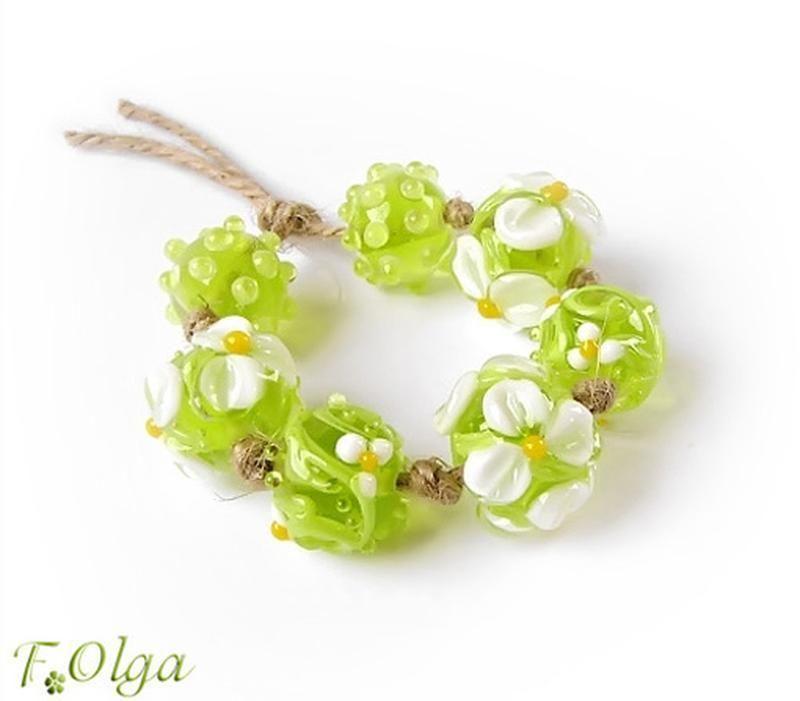 На замовлення. Термін виготовлення 7-15 днів. Набір намистин для створення прикрас в яскравою весняною гамі. Намистини в техніці лемпворк створюються вручну з італійського скла в відкритому вогні. Намистини проходять відпал в муфельній печі для додання міцності. Діаметр намистин 1.4 см, 1.6 см, 1.7 см (менше ніж на фото) Діаметр отвору 2 мм Товар виготовляється на замовлення
