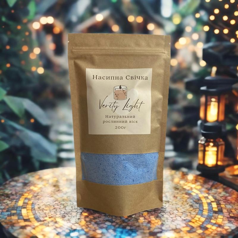Насипна свічка (пальмовий віск) синього кольору у подарунковому пакеті. Вага - 200 грам. У комплект входить гніт діаметром 20 см. Час горіння - 16 годин. *Ціна вказана за 1 пакет воску (вага воску 200 грам) та 20 см. гноту. Скляна ємність не входить до комплекту, на фото представлена для ілюстративності.