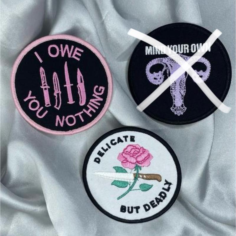Патчі кріпляться на одяг праскою Розмір 7,5 см -I owe you nothing В наявності 3шт -delicate but deadly В наявності 2шт Перед оформленням «Безпечної оплати» будь ласка, напишіть, який саме патч бажаєте придбати