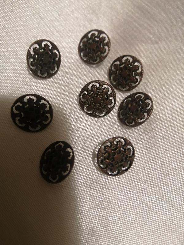 Метал схожий на латунь, діаметр 9 мм. На ніжці. Чудово підійдуть під блузку.