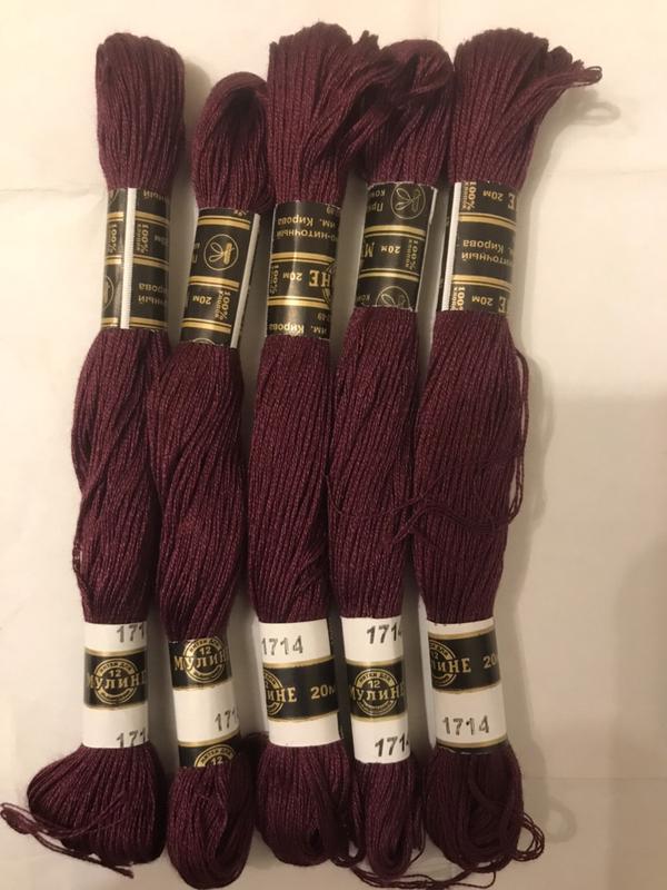 Колір 1714 фіолетовий Муліне виготовлені з високоякісного узбецького довговолокнистого бавовни, що гарантує м'якість і надійність у роботі. Мерсеризація обумовлює їхній блиск, а технологія фарбування гарантує світлостійкість, нитки не линяють при температурі до 60°С. Нитки для вишивання муліне в мотку 20 метрів, 100% мерсеризована бавовна, нитка має 12 складань. Мерсеризована обробка забезпечує блиск нитки, а спеціальна технологія забарвлення - світлостійкість.