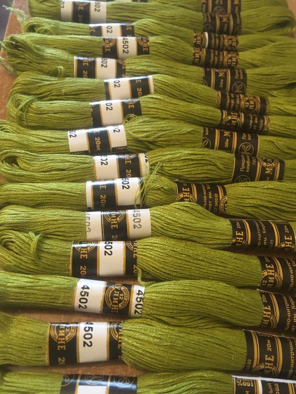 Колір 4502 зелений Муліне виготовлені з високоякісного узбецького довговолокнистого бавовни, що гарантує м'якість і надійність у роботі. Мерсеризація обумовлює їхній блиск, а технологія фарбування гарантує світлостійкість, нитки не линяють при температурі до 60°С. Нитки для вишивання муліне в мотку 20 метрів, 100% мерсеризована бавовна, нитка має 12 складань. Мерсеризована обробка забезпечує блиск нитки, а спеціальна технологія забарвлення - світлостійкість.