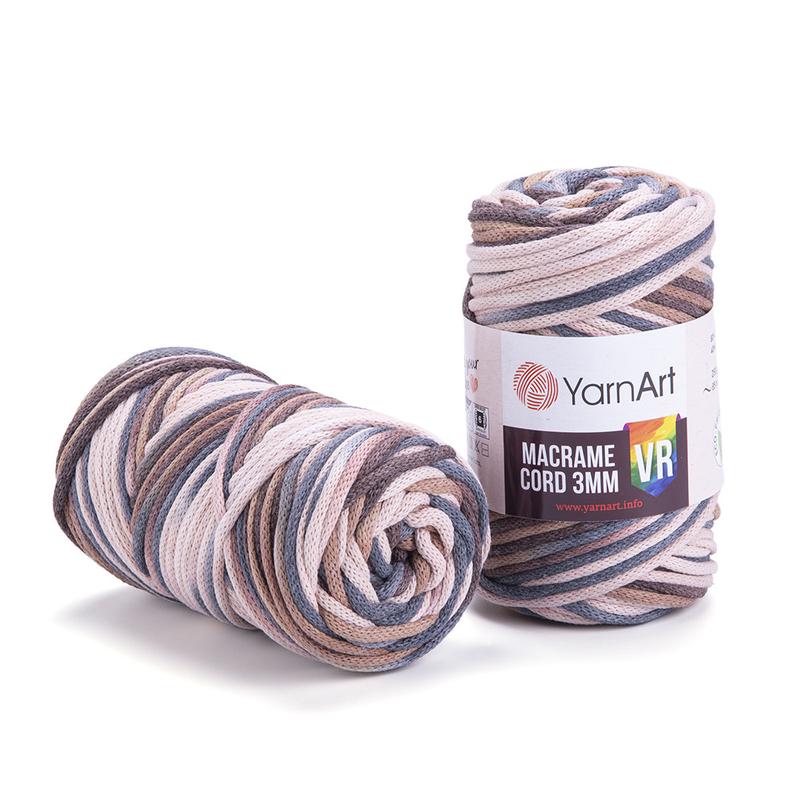 YarnArt Macrame Cord 3 мм VR - Склад: 60% бавовна, 40% віскоза та поліестер. - Тип пряжі: Шнур. - Вага мотка: 250 грам. - Довжина мотка: 85 метрів. - Упаковка: 4 мотки. - Рекомендовані спиці: 6-7мм. - Рекомендований гачок: 6-8мм. YARNART Macrame cord 3mm - це трикотажна нитка у вигляді шнурка. Дуже щільна, плетені (мотузкового типу) ідеально підходить для в'язання сумок, іграшок, килимків пледів і інших аксесуарів, а також предметів інтер'єру. Відтінки з нашого асортименту відмінно поєднуються між собою. Рекомендуємо ручне прання при температурі до 40 градусів С, не прати в пральній машині і не використовувати віджимання. Сушити на горизонтальній поверхні.