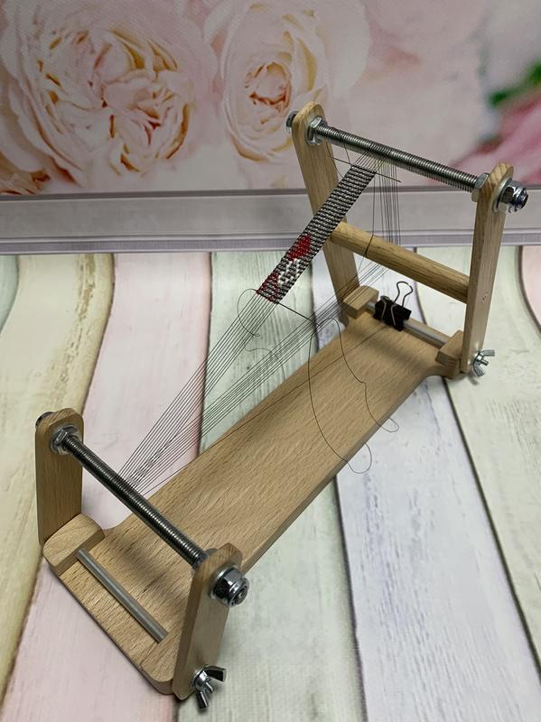 Виробник: Власне виробництво Тип продукту: Інструменти Кілька примірників у наявності Станок для виготовлення ґерданів, браслетів та поясів з бісеру. Розмір робочого поля 9/40. Станок деревьяний (бук +дуб), лакований. Легко складається. Зручний у використанні.