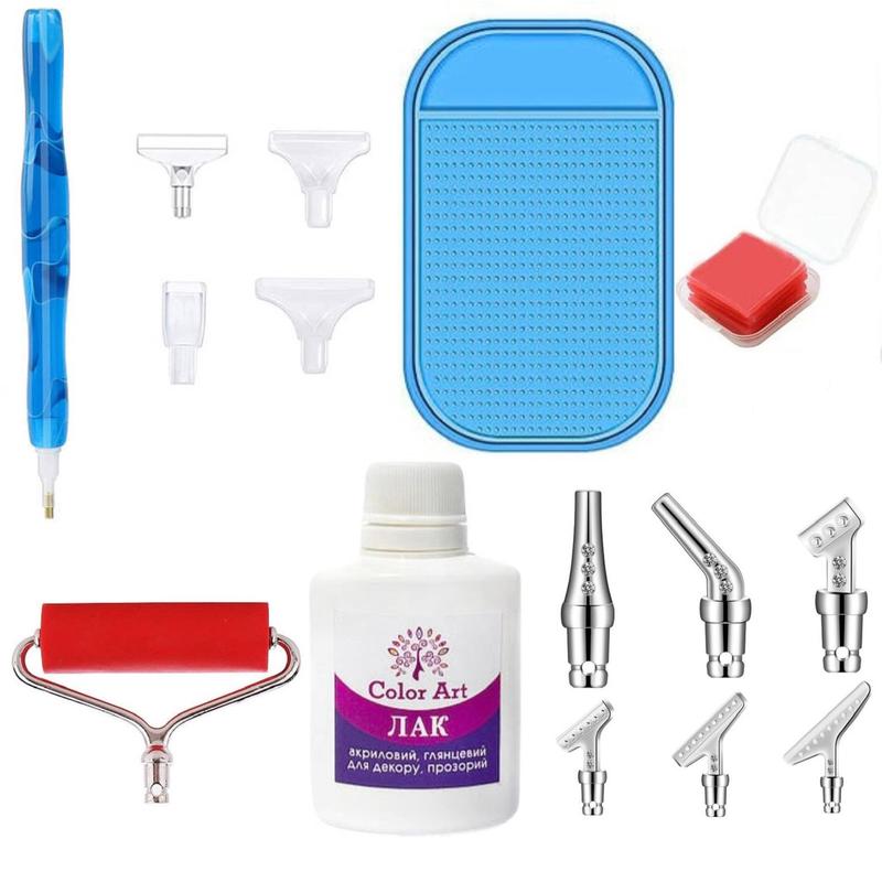 Набор инструментов для алмазной мозаики 15 элементов. В набор входит: - стилус с 4 пластиковыми насадками - комплект металлических насадок для стилуса алмазной мозаики 6шт - насадка валик для прижатия камешков алмазной мозаики - клей для алмазной мозаики в контейнере красный 5 шт - липкий антискользящий коврик подставка для лоточка - лак акриловый глянцевый ColorArt 20 мл для покрытия готовой работы. Закажите аксессуары для алмазной мозаики ColorArt, получите удовольствие от процесса выкладки и море положительных эмоций от результата выполненной работы.