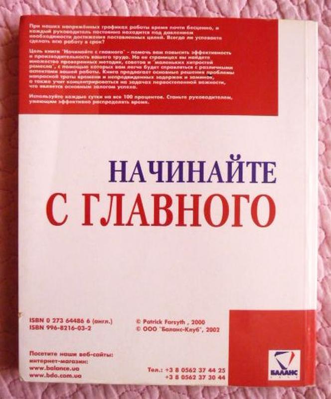 Починайте з головного. Як найбільш ефективно використовувати час. Патрік Форсит Видавництво «Баланс-Полуб», Дніпропетровськ, 2002г. Формат збільшений 70х90/16, мова російська, 192 стор. з таблицями, обкладинка — граничний картон, стан гарний. За наших напружених графіків роботи час майже неоціненний, і кожен керівник постійно перебуває під тиском потреби досягнення поставлених цілей. Чи завжди встигаєте зробити всю роботу в термін? Мета книги "Починайте з головного" — допомогти вам підвищити ефективність і продуктивність вашої праці. На її сторінках ви знайдете безліч перевірених методик, порад і "маленьких хитрощів ремесла", за допомогою яких вам легше буде справлятися з різними аспектами вашої роботи. Книга пропонує основні розв'язання проблеми мари часу та непередбачених затримок і замок, а також вчить концентруватися на завданнях першорядної важливості, що є основною запорукою успіху. Використовуйте щоденну добу на всі 100 відсотків. Стати керівником, який вміє ефективно розподіляти час.