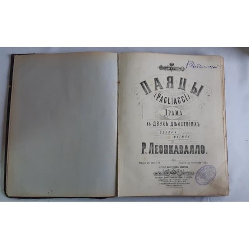 Р. Леонкавалло. Паяцы. Драма в двухъ действіях, слова и музыка Р. Леонкавалло. Изданіе А. ГУТХЕЙЛЬ, Москва 1893 г Эсклибрис Киевского магазина: L. Idzikowski. Kiew. Издание А. Гутхейль, 1893. – 137 стр.Формат:30.5на24.5см. Старинные ноты. Первое русское прижизненное издание.(Премьера оперы состоялась в Милане 21 мая 1892 года).КЛАВИР с ТЕКСТОМ, текст на итальянском и русском языке/