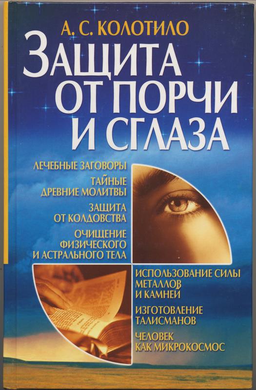 Колотило А.С. Защита от порчи и сглаза. Донецк, "БАО", 2004 г., 224 с. Твердый переплет, стандартный формат. Эта книга - практическое руководство по биоэнергетической самозащите. Читатель найдёт здесь заговоры, молитвы, способные обезвредить самое сильное негативное воздействие. Большое внимание уделено применению оберегов, талисманов, защите жилища и членов семьи от враждебного влияния. Аюрведические методики восстановления жизненных сил помогут поправить здоровье тем, кто пострадал от порчи или сглаза. Предлагаемые способы нетрадиционного лечения содержат элементы белой магии, обращающейся только к божественным светлым энергиям.