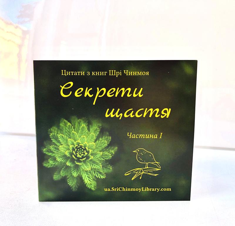 Цитати з книг Шрі Чінмоя "Секрети щастя", переклад українською мовою, частина 1. Брошура-листівка. "Я щасливий, тому що ... Я щасливий, тому що завжди обираю слушну мить. Я щасливий, бо вмію слухати. Я щасливий, тому що не підвищую голос. Я щасливий, бо не намагаюся переконувати інших. Я щасливий, тому що не скаржуся. Я щасливий, тому що не роблю дві справи одночасно. Я щасливий, бо ніколи не думаю про два об'єкти одночасно. Я щасливий, бо усвідомив істину, що найважливіше в моєму житті - це вдосконалення себе. Я щасливий, тому що беззастережно підкреслюю в інших хороше. Я щасливий, тому що значно скоротив свої потреби-бажання. Я щасливий, бо щодня дотримуюся своєї програми контролю над думками. Я щасливий, бо ніколи не сахаюся." Шрі Чинмой, Квіти медитації та завтрашній полудень Організації Об'єднаних Націй