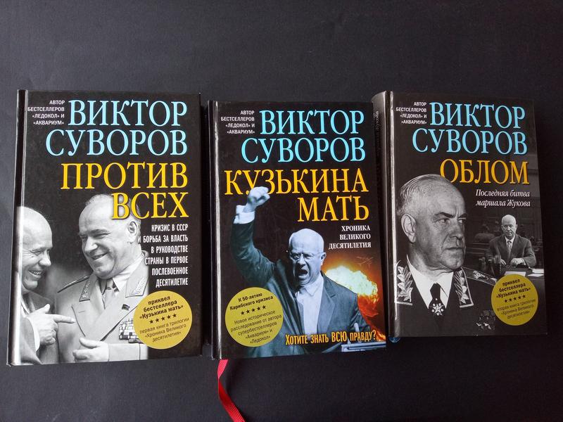 Ціна за комплект -три книги автора Віктора Суворова, справжнє ім'я якого Володимир Богданович Резун. Він колишній радянський офіцер ГРУ, який у 1978 році втік до Великої Британії. Книги є частинами трилогії, що має спільну назву «Хроніка Великого десятиліття»: «Против всех», «Кузькина мать» та «Облом». Віктор Суворов також є автором бестселерів «Криголам» та «Акваріум». У книзі «Криголам» він стверджує, що СРСР готував вторгнення до Німеччини в липні 1941 року, а Гітлер лише випередив його, розпочавши війну. Його роботи викликали численні дискусії та критику в історичних колах, а тиражі деяких книг перевищують мільйон примірників.