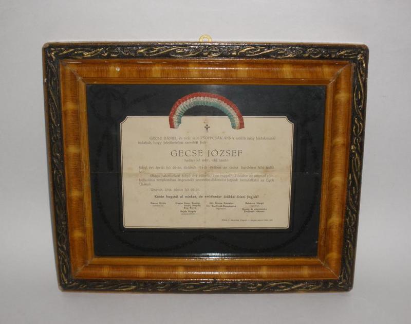 Похоронный лист (похоронка), на закарпатского венгра, Йосифа Гече, проживавшего в г.Ужгород, сражавшегося на стороне германских войск и погибшего в бою с русскими солдатами 24 апреля, 1944 года, в свои 24 года. Документ 100% оригинал! На оборотной стороне имеется адрес получателя, марка и почтовый штамп датированный 29 июня, 1944 года. Документ в старой раме под стеклом. Размер документа - 23см.Х 29,5см. Размер в раме - 31см.Х 37,5см. Все стороны и ньюансы документа представлены на фото. Редкий документ для Вашей коллекции или музея!