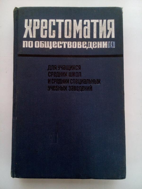 Рідкісне видання радянських часів "Хрестоматія з суспільствознавства", що вийшла в 1965 році як посібник для учнів середніх шкіл і середніх спеціальних навчальних закладів у московському видавництві "Політвидав". Хрестоматія складається з трьох розділів. У першому поміщені твори К. Маркса та Ф. Енгельса, у другому— твори в. І. Леніна, в третьому — партійні та державні документи, рішення, ухвалені а Нарадах комуністичних і робочих партій в 1957 і 1960 роках. Всередині першого і другого розділів твори розташовані в хронологічному порядку. Тому, щоб визначити, до якої з тем курсу рекомендується то илииное твір основоположників марксизму чи партійний документ, потрібно заглянути в кінець книги, де програми покажчик літератури до всіх тем програми курсу «Суспільствознавство». У виборі літератури з конкретних питань, що вивчаються на уроках, допоможе викладач. До роботи над текстом багатьох творів доведеться повертатися неодноразово у зв'язку з вивченням ряду тем курсу. Наприклад, робота в. І. Леніна «Великий почин» необхідна для засвоєння питань про класах експлуататорського суспільства, про характер праці при соціалізмі і комунізмі, про значення росту продуктивності праці для перемоги комунізму. Для того щоб глибше зрозуміти багатство ідей основоположників марксизму-ленінізму, партійних документів, треба правильно організувати роботу над ними. Починати вивчення будь-якого з поміщених у хрестоматії творів рекомендується з попереднього читання всієї роботи або. якого-небудь закінченого розділу. Таке читання дає цілісне уявлення про роботу або розділі, знайомить з колом освітлюваних питань, допомагає зрозуміти логіку автора. Книга стандартного формату, у твердому вініловому палітурці з відбитком, містить 382 сторінки. Стан хороший, з дефектів - трохи намальована перша сторінка.
