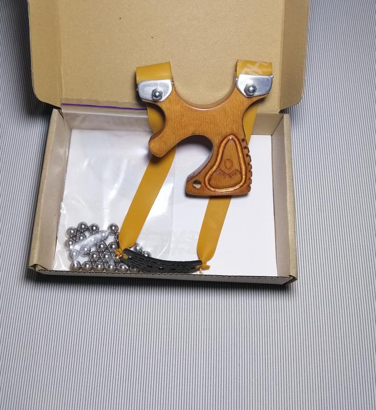 Тип зброї: Рогатки Компактная и легкая рогатка «************ - метательное устройство рассчитано до 15 кг натяжения, которая легко помещается в кармане. Метательное устройство до 20 кг натяжения, не требующее документов и регистрации, исходя из положения номер 32457 от 28.03.2018 не является холодным оружием! Будет интересна не только для детского развлечения, но и в спортивных целях - тренировки меткости, охоты и рыбалки. Для спортивной стрельбы можно использовать металлические шарики или камешки округлой формы. Для рыбалки используются дротики, которые можно приобрести отдельно. Наше детство было насыщено приключениями и различными активными играми. Свою "игрушку" каждый делал сам. У нас не было выбора пистолетов, автоматов или ручных гранат как в компьютерной игре. Самой распространенной "игрушкой" была, конечно же, рогатка. Трудно представить себе мальчишку, который бы не знал, что это такое и не стрелял из нее. Кто по бутылкам или консервным банкам, а кто и по стеклам или уличным фонарям. Эта деревянная рогатка сделана как будто ребенком, но с дополнительным прикосновением взрослого мастерства. Этот подарок заставит сиять глаза взрослого ребенка, а сердца биться быстрее. Будь то лесная прогулка или стрельба в саду, веселье и действие гарантировано. Но за детьми требуется наблюдение взрослых. Рогатка будет хорошим подарком также для вас или ваших друзей. Это принесет вам удовольствие и приятное развлечение. Крутое хобби и спортивная деятельность! Подходит не только для пеших прогулок и кемпинга, но достаточно мощная для охоты или рыбалки. Подробности: • Рогатка сконструированные на повышенную мощность. • Имеет эргономичную форму для комфортной стрельбы. • Основа рогатки - фанера ФСФ 15мм, покрыта защитным покрытием Polifarb. • Установлены плоские тяги из ленты TheraBend Gold 22х12мм. • В подарок 10 стальных шариков 8мм, для пробной пристрелки. • В подарок две бумажные мишени, которые использовались на чемпионате мира по стрельбе из рогатки. Характеристики ленты TheraBend Gold: Структура: латекс. Цвет: золотой. Нагрузка: максимальная плотность. 9.5кг Уровень: 8 В комплект входит: - рогатка, 10 стальных шариков, 2 мишени, что бы Вы сразу смогли начать, и подарочная упаковка. Эта рогатка сделана в 1 экземпляре, но вы можете заказать любое количество, которое вам нужно под заказ. Рогатка будет хорошим компаньоном для вашего следующего приключения на открытом воздухе. Так возьмите рогатку и идите на улицу!