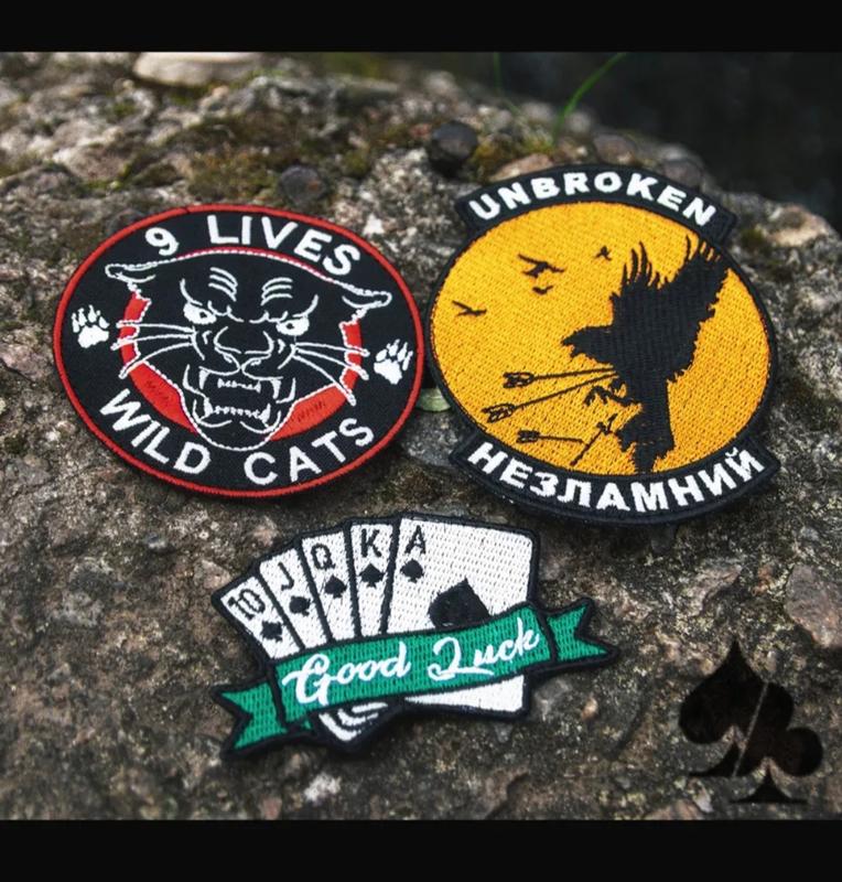 Набір із 3-х шевронів (можна окремо 250 грн шт) 1. Невеликий шеврон - талісман покликаний приносити успіх. Виріб зображує виграшну комбінацію royal flash, ймовірність випадання якої дорівнює 1:650 000 2. 9 життів Дикі коти Фірмовий шеврон, який доповнює нашу серію wild cats 3. Фірмовий шеврон символізує стійкість та силу духу