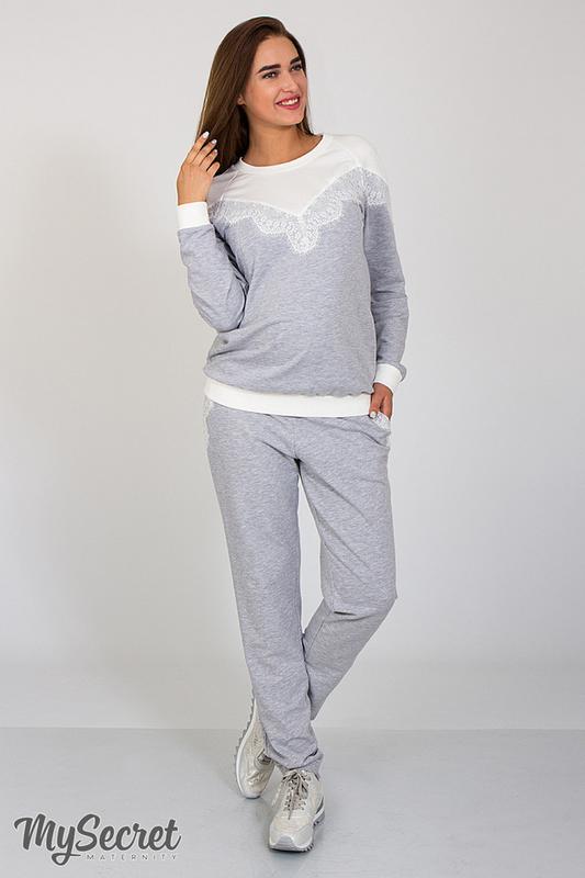 Нарядний костюм для вагітних та годуючих. Складається зі світшота і штанів. Стильний світшот в стилі "повсякденний шик". Поєднання трикотажу двунитки двох кольорів з мереживом шантільї створюють яскравий і закінчений образ, при всій зручності класичного фасону світшота. В потайних блискавках в нагрудних рельєфах захований секрет для годування. Стильні, спортивні штани з трикотажу двунитки з обробкою мереживом шантільї. Приємна тканина, вільний фасон і зручні кишені зроблять період вашого «очікування» максимально комфортним. Бандажний пояс добре підтримує животик і дозволяє носити цю модель і після вагітності. Колір: сірий меланж з молочним мереживом. Склад: 70% бавовна, 30% поліестер. У нас в інтернет-магазині Маминстиль.сом Ви знайдете одяг для вагітних та годуючих на будь-який смак, зможете оцінити різноманітність кольорів і моделей. А зробив замовлення, остаточно переконайтеся в якості нашого товару та обслуговування.