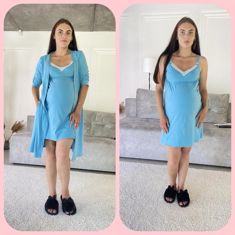 Комплект для вагітних і годуючих матусь. Комплект з халатика та нічнушки дуже потрібна та практична річ у гардеробі кожної жінки. Особливо це актуально для пологового будинку. Халатик з кишенями, а ночнушечка максимально комфортна для молодої мами. Комплект складається з халата на запах, під пояс із кишенями та нічнушки на тонких бретелях із мереживом у зоні декольте. Секрет годування кліпса-засувка на бретелі, супер зручна штука!) Колір: блакитний 💙 Розмір: 44-46,48-50,52-54,56-58 у наявності. Ціна 590 грн. 💟 Допоможемо у підборі розміру 💟 Доставка УкрПошта та НоваПошта 💟 Повна передплата на картку Для замовлення пишіть у Директ