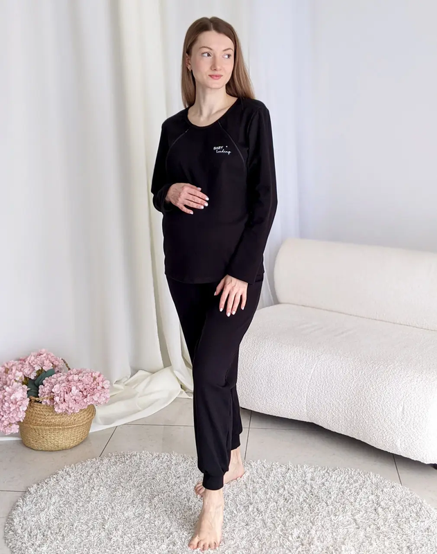 Домашній комплект для вагітної і годуючої мами, теплий Комплект виконаний із щільного бавовняного полотна на мікрофлісі. Тканина добре тягнеться, прекрасно зберігаючи форму в спокійному стані. Не піддається усадці. Кофта піжами має дві блискавки по боках грудей, штани-джогери вільного крою, висока посадка на резинці, що регулюється по об'єму, дві внутрішні кишені. Розміри: 42/44, 46/48, 50/52, 54/56 Розмірна сітка: 42-44: ОГ/ОБ 90-98 46-48: ОГ/**********: ОГ/ОБ 108-118; 54-56: ОГ/ОБ 118-128