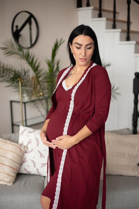 Красивый набор для будущих мам. Комплект состоит из халата с четвертным рукавом, с карманами и поясом и ночной рубашки с присборкой под грудью. Халат и рубашка украшены красивым стрейч кружевом. Полотно изделия турецкий кулир пенье, который состоит на 100% из хлопка. Мягкое полотно изделия будет приятным к телу и подарит комфорт. Комплект подходит как на время беременности так и на период кормления грудью. Уход: температурный режим стирки 30-40 градусов. Халат средней длинны 100 см, ночная 95 см.