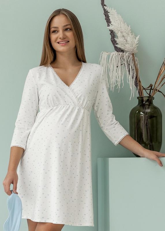 Базовая ночная рубашка для беременных и кормящих из хлопкового трикотажа. Силуэт: полуоблегающий лиф и свободная юбка. Секрет кормления: запаях на груди. Отделка: ажурная резиночка по горловине и низу рукавов. Ткань: хлопковый трикотаж. Растяжимость ткани: около 20-25%. Цвет: голубые звезды на молочном фоне. На фотографии: размер на модели S, объем груди 90 см, бедер 96 см, рост 173 см. Ориентировочные замеры готового изделия: S: Длина по спинке 89 см, Длина рукава 44 см, Грудь 88,4 см, Талия 96 см, Бедра 112,6 см. M: Длина по спинке 90 см, Длина рукава 44,2 см, Грудь 92,4 см, Талия 100,6 см, Бедра 117,2 см. L: Длина по спинке 90 см, Длина рукава 44,5 см, Грудь 96,2 см, Талия 105 см, Бедра 121,6 см. XL: Длина по спинке 91 см, Длина рукава 44,7 см, Грудь 100,6 см, Талия 109,8 см, Бедра 126,6 см. 2XL: Длина по спинке 92 см, Длина рукава 45 см, Грудь 105 см, Талия 114,8 см, Бедра 131,6 см. Состав: 95% Cotton, 5% Elastane.
