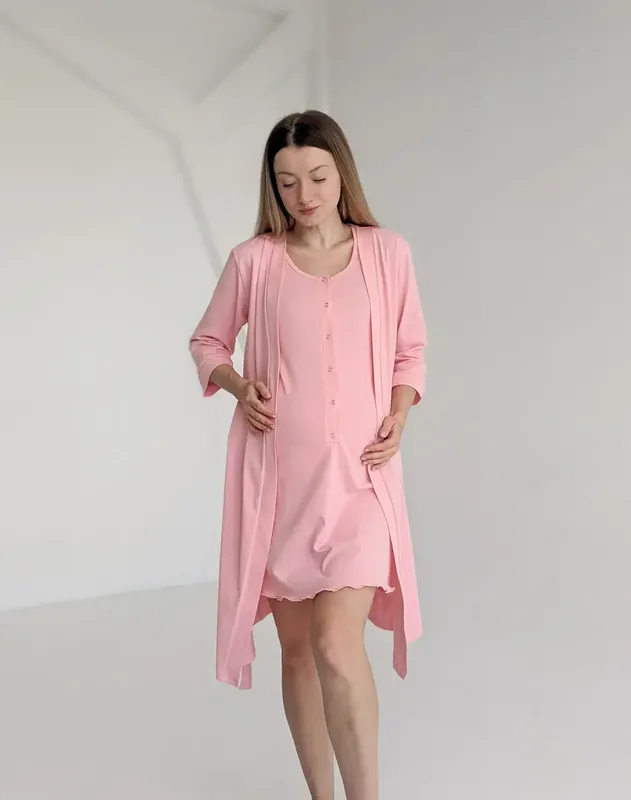 Легкий та зручний комплект, пошитий із тонкої, дихаючої тканини. Складається із халату та сорочки. Деталі: сорочка на широких бретельках, А-силует, подовжена планка на кнопках; халат на запах з поясом, рукав три чверті, два кармани. Розміри: 42-44, 46-48, 50-52, 54-56 Матеріал: 100% бавовна