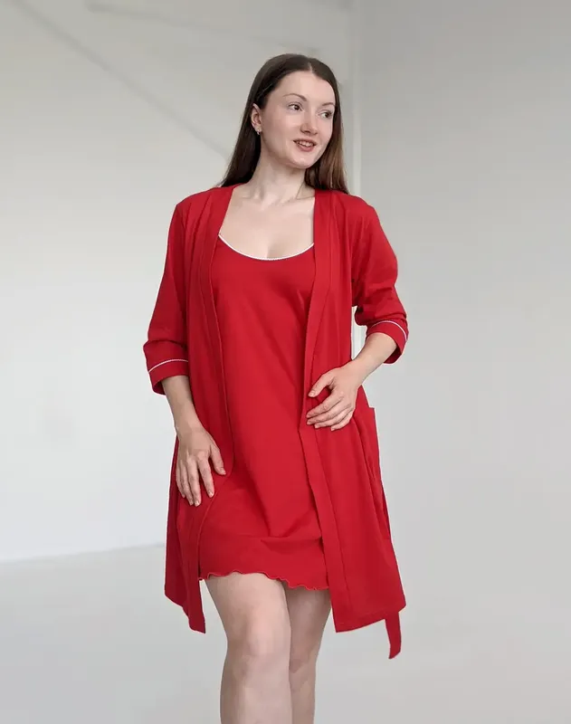 Легкий та зручний комплект, пошитий із тонкої, дихаючої тканини кулір. Складається із халату та сорочки. Деталі: сорочка з кліпсами для зручного грудного вигодовування, тонкі бретельки з регулятором довжини, А-силует; халат на запах з паском, рукав три чверті, дві кишені. Розмір: 42-44, 46-48, 50-52, 54-56, 58-60