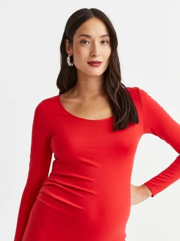 Приталенное платье из трикотажа длиной до колена с глубоким вырезом и длинными рукавами. Складки с одной стороны талии для создания эффекта драпировки и асимметричный край