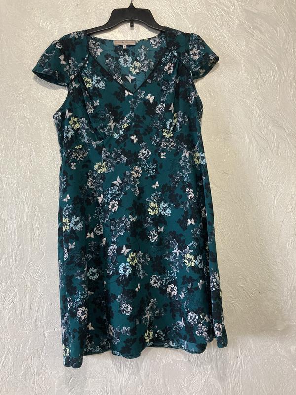 Second Легесенька сукня, на розмір грудей 3-4 Має запас для живота, ззаду на резинці, тканина приємна до тіла, склад не вказано Розмір сукні 16uk Заміри Під руками 55 Талія 47/50 Стегна до 63 напівобхват Довжина сукні 91см Колір бутилка
